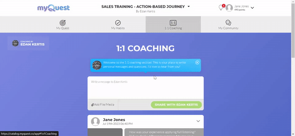 Utilize AI to provide personal feedback at scale. myQuest trains AI on your content, allowing you to use it as your assistant, suggesting feedback in your 1:1 coaching interactions, or as a fully automated process where learners receive feedback on every activity they complete during the program.