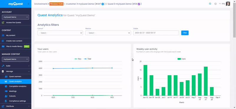 myQuest LMS gives you access to powerful analytics and insights into each trainee's engagement and activity. Get full visibility on what's going on when you are not next to your learners and improve the ROI and results of your training.